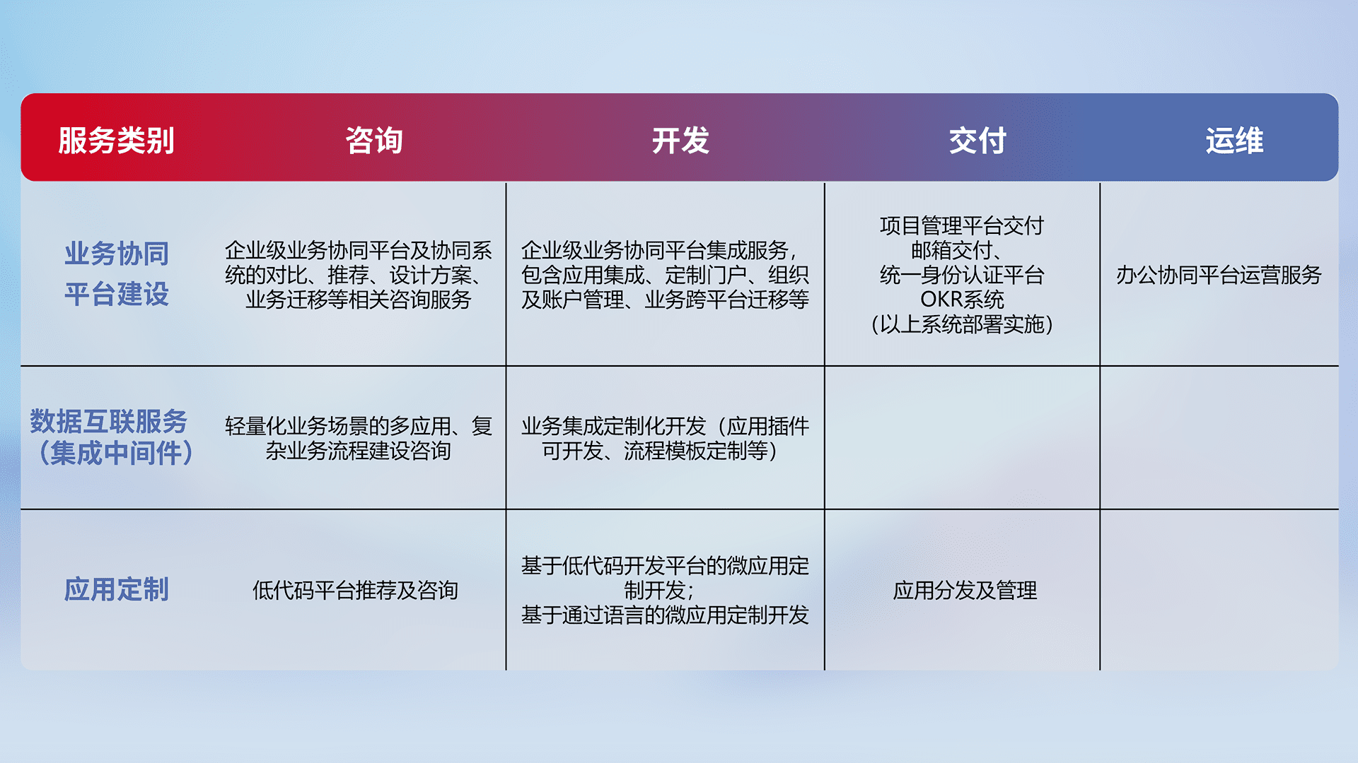 针对钉钉、、、企微、、、IDaas等平台级产品提供产品的规划、、、、方案、、交付、、、定制化开发等服务,,,,实现如统一协同办公、、、、智能客户服务、、、混合会议管理、、、智能数据查询、、、、等业务场景,,,,实现数字化转型。。